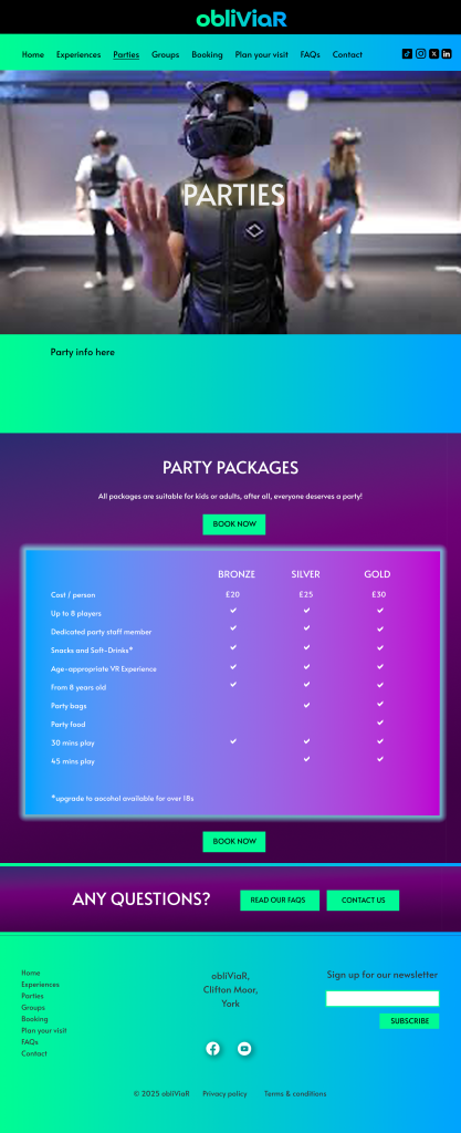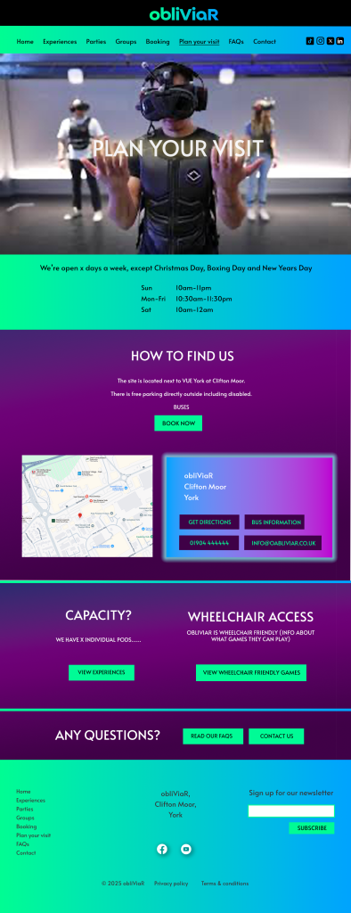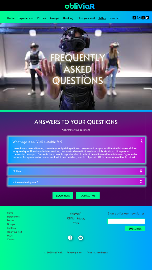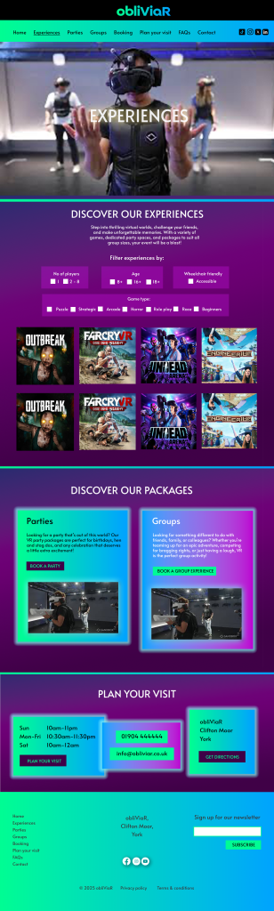 I designed all of obliViaR's other pages in Adobe Photoshop. Ignore the dummy content! Mike Rigley, the developer, used them as a basis for his bespoke web development.